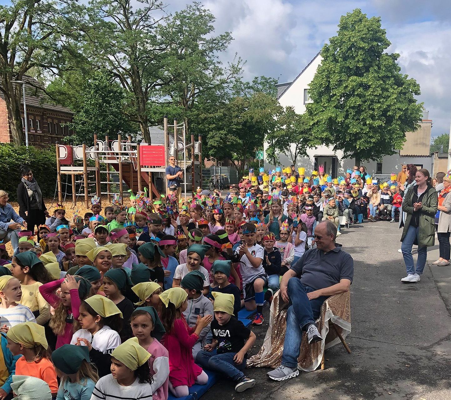 Alle Kinder der Wilhelm-Busch-Schule trafen sich auf dem Schulhof am Standort Richrather Straße vor einer liebevoll und aufwändig gestalteten Bühne.