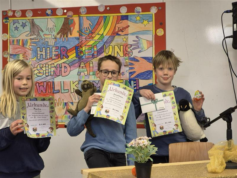 Alle Dritt- und Viertklässlerinnen und -klässler haben in Ihren Klassen einen Lesewettbewerb durchgeführt. Schließlich blieben drei Klassensiegerinnen oder -Sieger in jeder Stufe übrig. Diese durften am 13. Und 14. März schließlich gemeinsam antreten, um den oder die Beste unter ihnen zu küren.