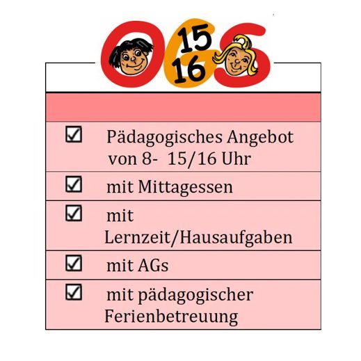 Mit der Anmeldung zur OGS verpflichten sich die Eltern, zur Teilnahme des Kindes an der OGS für täglich von 8.00 Uhr bis mindestens 15.00 Uhr (Betreuungswahl OGS-15 Uhr) oder bis 16.00 Uhr (Betreuungswahl OGS-16 Uhr).